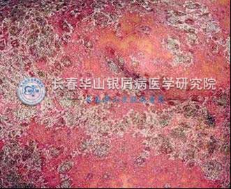 (4)全身损害及继发感染:红皮病型银屑病少见而严重,表现为周身皮肤弥漫性潮红或暗红,肿胀或伴有渗出,表面覆有大量麸皮样鳞屑患者伴有头痛、发热、畏寒等全身不适,浅表淋巴结肿大,白细胞计数增高。若没有及时正确处理极易造成死亡。副银屑病由于皮损面积大,细菌易于侵入会导致败血症而死亡;由于血液粘稠度增高、血容量不足等,导致心力衰竭而死亡;亦可由于肝肾功能衰竭而导致死亡。