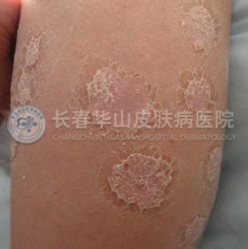 二,此病发展过程中,皮损形态可表现为多种形式。急性期皮损多呈点滴状,鲜红色,瘙痒较著。静止期皮损常为斑块状或地图状等。消退朔皮损常呈环状、半环状。少数皮疹上的鳞屑较厚,有时堆积如壳蛎状。