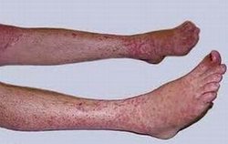 2、红皮病型牛皮癣:初起时在原有银屑病皮损部位出现潮红,迅速扩延成大片,最后全身呈现弥漫性潮红浸润,常见的四种牛皮癣症状分类之二,在弥漫性潮红浸润中,常有片状正常“皮岛”,为本病的特征之一。