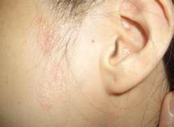 牛皮癣的急性发疹期或皮损泛发时,脸部也可出现皮疹,或由头皮损害扩展而来.有时头、面部牛皮癣损害也可单独发生,多见于额、颊、颓、眉及耳后、耳窝、外耳后处.脸部牛皮癣皮损大多呈点滴状的斑丘疹或指甲盖大小的红斑,鳞屑较少或无鳞屑,有时也可表现为脂溢性皮炎样或红斑狠疮样皮损,常伴有瘙痒.如出现这种情况,患者一定不要用手用力的去抓挠,以免加重皮损的症状。