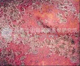 寻常型牛皮癣:临床上最为常见,大多急性发病,迅速扩延全身。初起损害往往是红色或棕红色的丘疹、或斑丘疹。以后逐渐扩展,成为棕红色的斑块。皮损上覆盖干燥的鳞屑。边界清楚,相邻的损害可以互相融合。本病的鳞屑呈银白色,逐渐增厚,刮去鳞屑可出现半透明的薄膜,有人称为薄膜现象。剥去薄膜出现点状出血,称为Auspitz氏征。