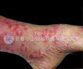 (3)脚上牛皮癣的症状:是脚部皮肤会有明显的化性斑片,中央半片斑片较厚,而且会有点状白色鳞屑。