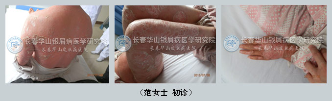 来自公主岭的范女士饱受银屑病10余年之困扰,家中哥哥有银屑病史,于6个月前,无明显诱因于前胸出现红色的粟粒样大泪的红色点状丘诊,去多家诊所治疗,病情时有好转,因疗效不佳,自行停药(注:曾口服激素类药物及外用药膏(药名不详)),后经亲戚介绍来到我院进行诊治。