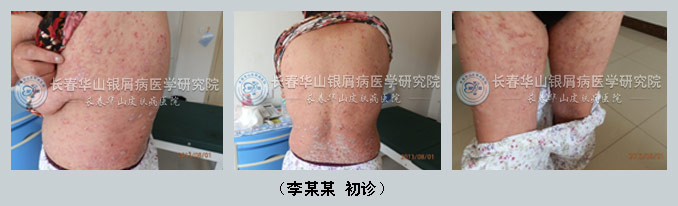 来自梨树的李某某,8年前因全身无原因的出现红色如粟粒样大小的点状丘诊,曾口服、外用激素类药物及免疫抑制剂,病情时轻时重,反复发作。于213年7月31日来到我院,经检查,该患者头部散在鳞屑性斑块,躯干部、四肢密集多发红色斑丘疹及斑块,上覆白色鳞屑,基底部红肿,指甲凹凸不平,病情较重。