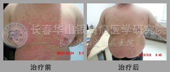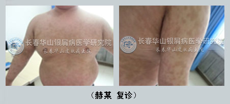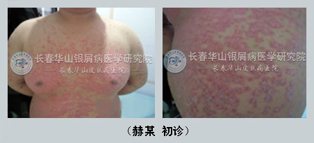 【患者自述】在赫某16岁的时候就患上牛皮癣了,起初是扁桃体化脓高烧,高烧后前胸和肚子加手臂就起了米粒样的丘诊,后去医院被确认为牛皮癣,家长焦急万分四处求医,看了好多医院,都是治疗好转,停药又复发,久而久之使全身均出现皮诊。后来父母多方打听,于2012年10月24日来到长春博润银屑病医院,就抱着一线希望来治疗。