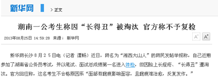 长沙晚报随后也发表《湖南一公考生发贴称因“长得丑”被淘汰》的文章,文章中提到:根据一篇名为《湘西公务员考试体检坑爹:脸上有痘痘说我长得丑不合格!》的举报贴描述,“湘西大山人”今年参加了湖南省公务员考试,报考的职位是湘西州公安局网络民警,并以笔试、面试总分第一名进入体检程序。在8月4日的体检中,因他脸上长有痤疮,一名医生说:“人民警察要形象,长得丑不能当警察。”次日,由另一名皮肤科专家检查后,勉强通过。但一名带队参加体检的非医务人员劝他主动写申请放弃资格,以避免今后的麻烦。他拒绝这一建议后,对方还是作出了“不合格”的结论,且不能参加复检。