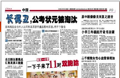 羊城晚报发表的《长得丑,公考状元被淘汰》也引起不小的议论,文章介绍:湘西自治州人力资源和社会保障局23日回应称,在体检中,该局只采用指定体检机构的体检结论。本次公务员考试体检中,医生的业务处置未受干预,医生严格按照规定的体检项目和标准对考生进行身体检查,独立作出判断。三名专家医生对这名考生检查会诊的意见为“面部有瘢痕影响面容,且瘢痕难治愈,易反复发作,根据《公务员录用体检特殊标准》第一部分第三条规定明确要求‘对影响面容且难以治愈的皮肤病(如白癜风、银屑病、血管瘤、斑痣等),或者外观存在明显疾病特征(如五官畸形、不能自行矫正的斜颈、步态异常等),为不合格。’最终结论为不合格”。