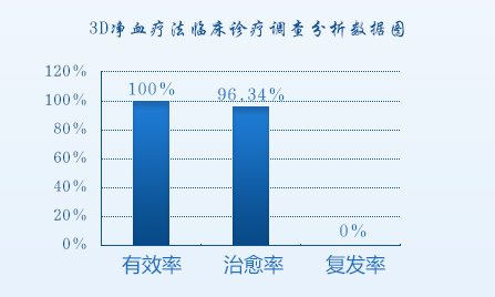 3D净血疗法治疗全程安全无毒副作用、治愈率高、复发率低,一般患者治疗7日皮肤瘙痒、疼痛减轻,进行期转变为消退期。1-3月轻、中度银屑病患者即可达到临床痊愈,临床观察表明,治愈率约为96.34%,总有效率达100%。