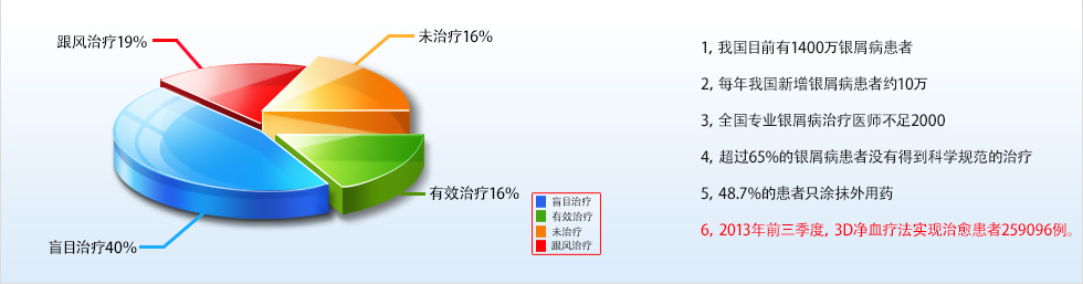 中医认为银屑病的发病与人体血虚、血燥、血热有关,通过现代医学的研究也佐证了这一点,银屑病发病是微循环—内分泌—免疫系统失衡的过程。3D净血疗法通过自体血净化过程,祛除血液中积聚的毒素、垃圾,恢复正常血液细胞滋养功能,减少病变细胞生成;通过传统中医内调,清热凉血、滋阴润燥、祛风通络;中西医结合绿色治疗、安全、无任何毒副作用。真正做到内外兼修,标本兼治的功效。