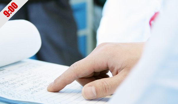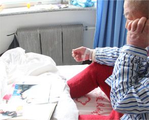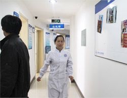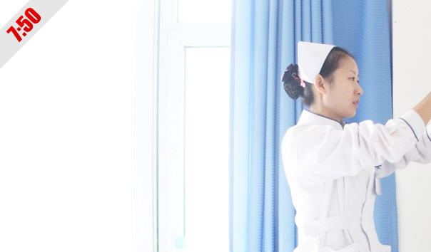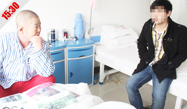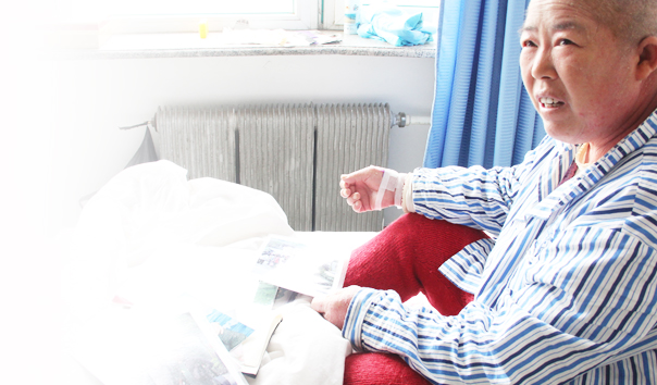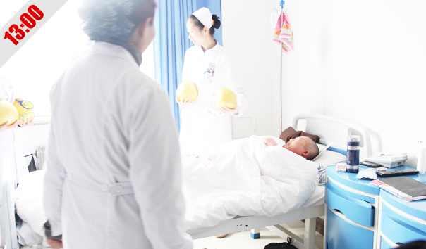 9:45 吊瓶里的药水快完了,护士小晶来给老胡换吊瓶,小晶是老胡的责任护士,除了工作内容之外,对老胡的起居都考虑的很周到,老胡笑言:"小晶这丫头一有空就来给我'上课',给我讲一些很新鲜的东西,听她讲着我感觉自己也年轻了许多,心境也开阔了。"